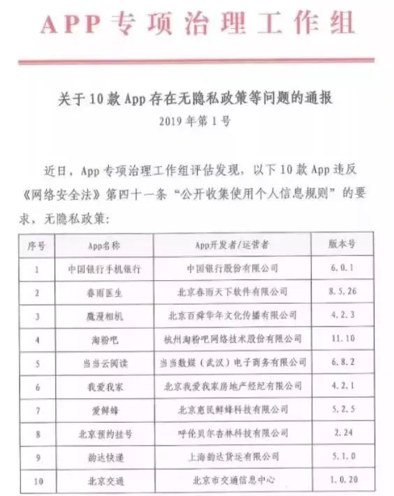 7月12日,工信部官方公众号发布《关于10款APP存在无隐私政策等问题的通报》,包括中国银行手机银行、春雨医生、魔漫相机、淘粉吧、当当云阅读、我爱我家、爱鲜蜂、北京预约挂号、韵达快递、北京交通等10款APP因无隐私政策被通报“点名”。