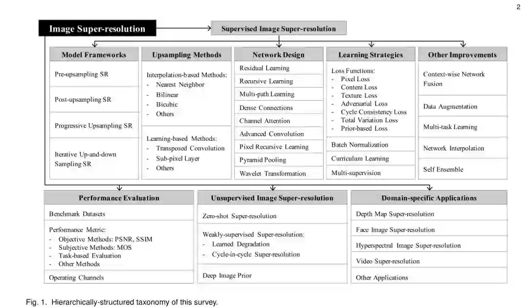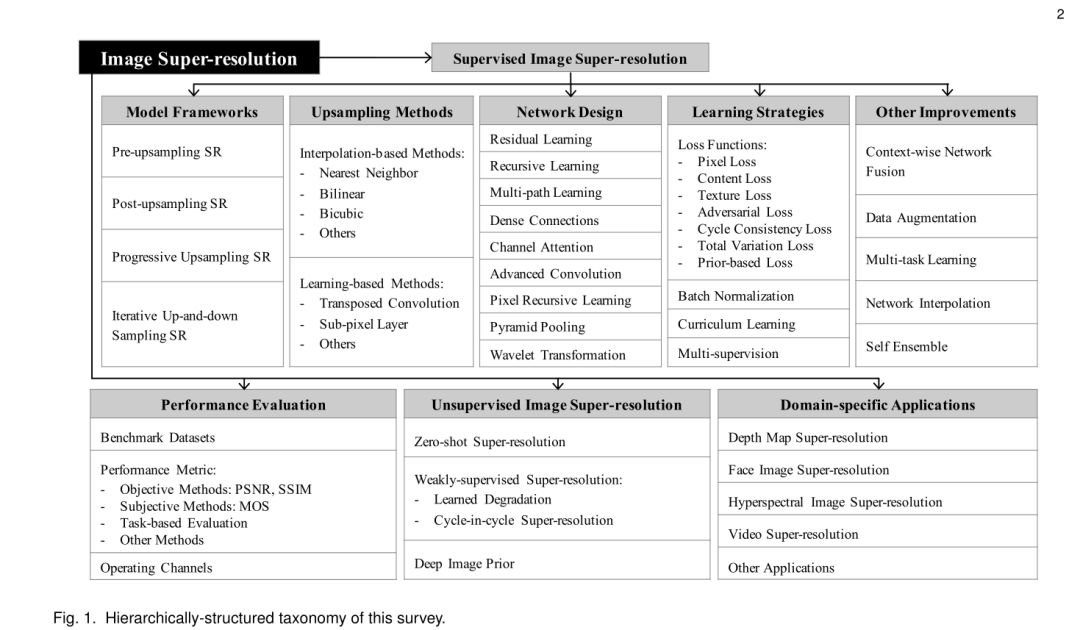 给出了综合性的基于深度学习的图像超分技术综述,包括问题设置、数据集、性能度量、一组基于深度学习的图像超分方法集合,特定领域的图像超分方法应用等等。