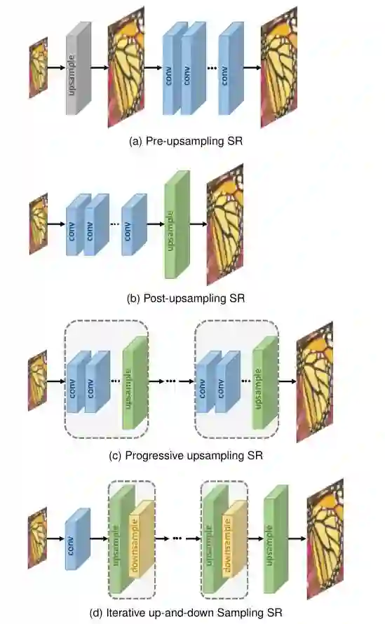 根据升采样(upsampling)在网络结构中的位置和使用方式,可以把超分网络结构设计分为四大类:前端升采样(pre-upsampling)超分网络、后端(post-upsampling)升采样超分网络、渐进式升采样(progressive upsampling)超分网络、升降采样迭代式(iterativeup-and-down sampling)超分网络。
