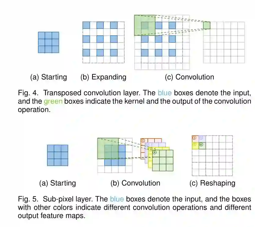 亚像素(sub-pixel)卷积,同样可以嵌入到端到端的网络结构中,使用正常的卷积结构,但是输出的通道数(channel)与目标分辨率有关,随后对这些通道进行“洗牌”(shuffle)操作,类似于像素重排,得到与目标分辨率相同的输出。亚像素卷积与转置卷积相比,最大的优势在于神经元的感受野较大,可以为超分辨率重建提供更多上下文信息,但是这些神经元感受野的分布是不均匀的,像素“洗牌”操作中同一个小块状区域(blocky region)的感受野相同,容易在一些边缘区域产生伪影现象。