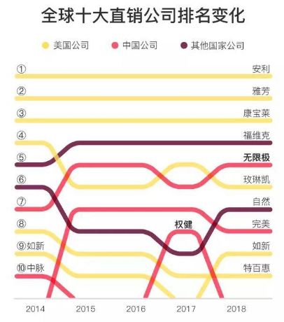 根据美国直销杂志《直销新闻》《Direct Selling News》公布的2018年度“DSN年度全球直销100强榜单”,安利、雅芳和康宝莱营收位居前三名,无限极名列第五位,是营收规模最大的中国直销公司,年营收高达39.2亿美元。品牌价值高达658.69亿。