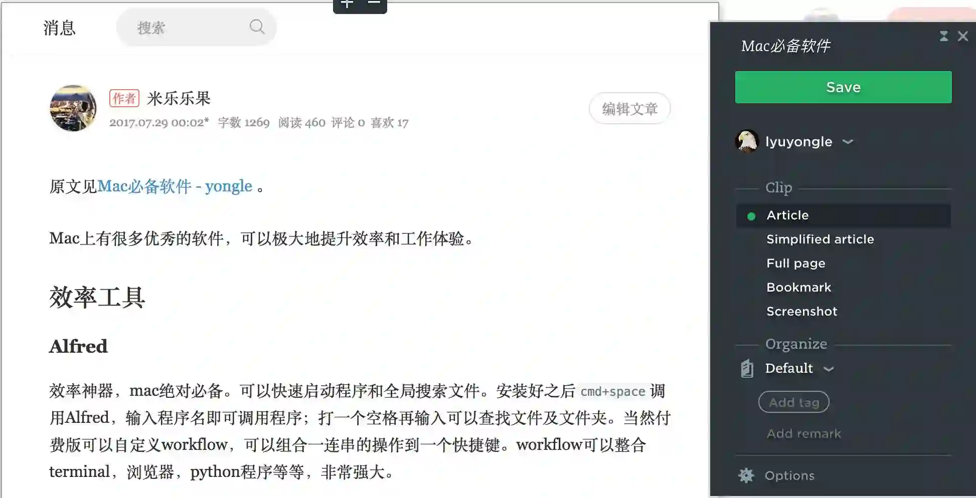 看到一篇好文章,保存链接不放心,怕链接失效;复制粘贴太麻烦。用Evernote Web Clipper:https://evernote.com/intl/zh-cn/products/webclipper/,直接保存富文本格式的文章,还只能去除广告,好用。