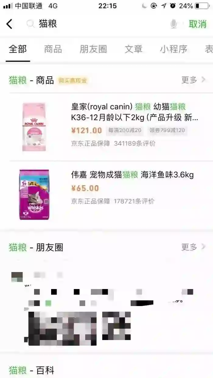 @凤凰科技【微信电商新动作,微信“搜一搜”入口出现京东商品】在微信搜一搜搜索部分特定关键词,搜索结果会出现“商品”类目,并在所有搜索结果中置顶。“护发素”、“猫粮”、“纸巾”、“面膜”关键词,都搜索到了相关的商品名称、价格、评价数量以及“京东正品保障”的标识。