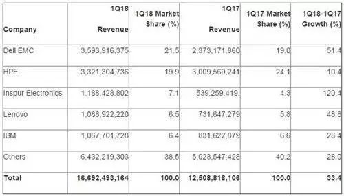 @TechWeb【Gartner:一季度全球服务器市场营收166.9亿美元,同比大增33.4%】据国外媒体报道,市场研究机构Gartner发布的报告显示,该季全球服务器市场营收为166.9亿美元,去年同期为125.1亿美元,同比增长了33.4%。