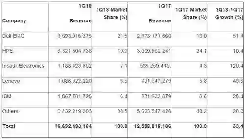 同营收增幅相比,一季度服务器的出货量增幅明显要低,从Gartner报告中提供的数据来看,一季度全球服务器的出货量为305.2万台,较去年同期的260.2万台增长了17.3%,远低于营收33.4%的增幅,也就意味着一季度服务器的平均售价在提高。