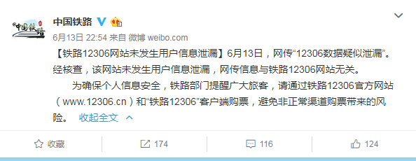 昨晚22点54分,中国铁路总公司通过其官方微博“辟谣”称:经核查,该网站未发生用户信息泄漏,网传信息与铁路12306网站无关。
