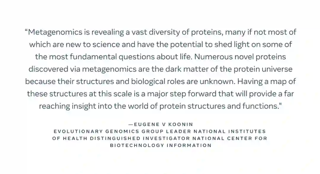 我们知道,基因测序的进步使得对数十亿个宏基因组蛋白序列进行编目成为可能。但是,通过实验确定数以亿计蛋白质的 3D 结构远远超出了时间密集型实验室技术的范围,例如 X 射线晶体学,它可能需要数周乃至数年的时间来检测单个蛋白质。计算方式可以让我们深入了解使用实验技术无法实现的宏基因组学蛋白质。