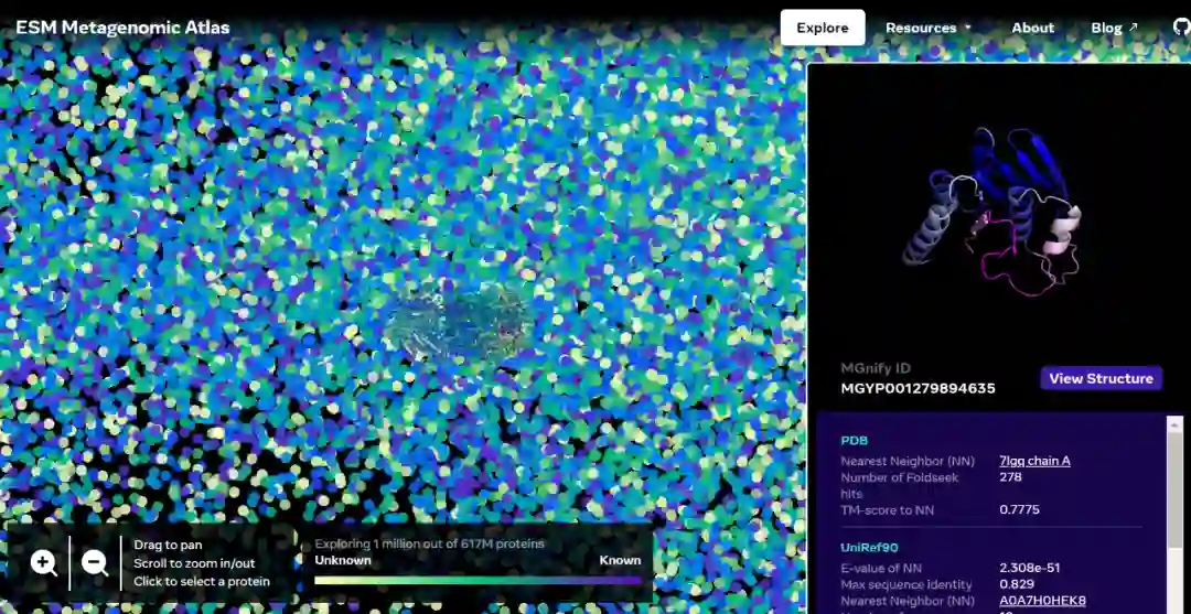 如今,作为测试,Meta 决定将他们的模型应用于宏基因组 DNA 数据库,这些 DNA 全部来自环境,包括土壤、海水、人类肠道、皮肤和其他微生物栖息地。Meta AI 宣布推出包含 6 亿多个蛋白质的 ESM 宏基因组图谱(ESM Metagenomic Atlas),它是首个蛋白质宇宙「暗物质」的综合视图。这还是最大的高分辨率预测结构数据库,比任何现有的蛋白质结构数据库都要大 3 倍,并且是第一个全面、大规模地涵盖宏基因组蛋白质的数据库。
