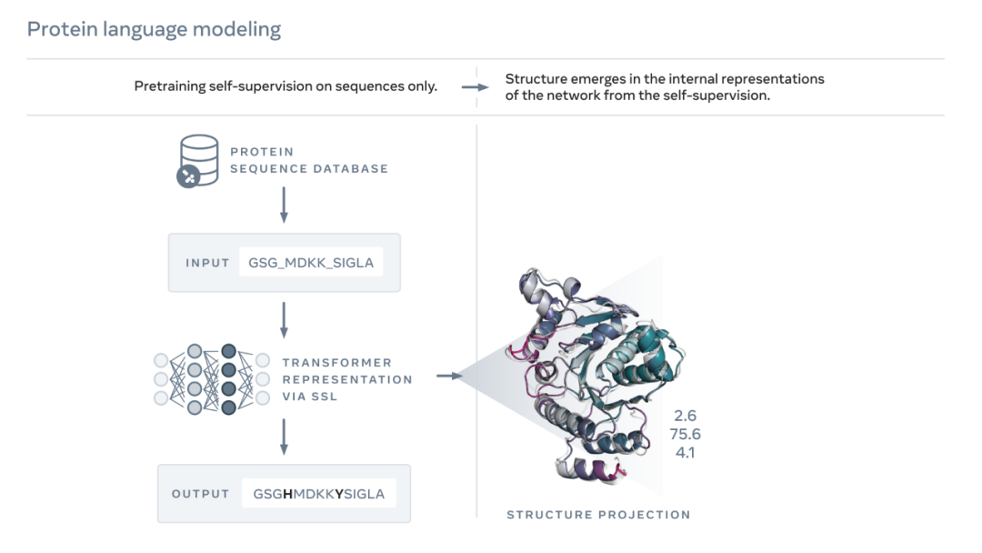 之后,Meta AI 训练了一个语言模型来填补蛋白质序列中的空白。他们发现,蛋白质结构和功能的信息在这一训练中浮现了出来。2020 年,Meta 发布了一个 SOTA 蛋白质语言模型 ESM1b,用于各种应用,包括帮助科学家预测 COVID-19 的演变以及发现疾病的遗传原因。