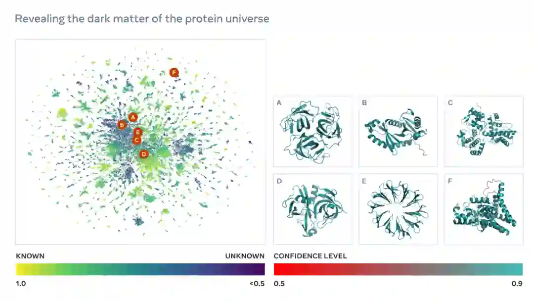 Meta AI 开发的新的蛋白质折叠方法,该方法利用大型语言模型,在宏基因组数据库中(具有数亿蛋白质)创建了首个全面的蛋白质结构视图。Meta 发现,相对于现有的 SOTA 蛋白质结构预测方法,语言模型可以将预测蛋白质原子级三维结构的速度提高 60 倍。这一进展将有助于加速蛋白质结构理解的新时代,这是首次人类有可能了解基因测序技术正在编目的数十亿蛋白质的结构。