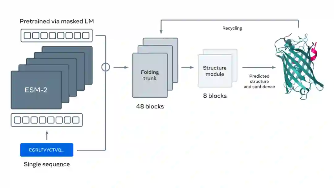此外,当前 SOTA 结构预测方法需要搜索大型蛋白质数据库以识别相关序列。这些方法实际上需要一整组进化相关的序列作为输入,以便它们可以提取与结构相关的模式。Meta AI 的 ESM-2 语言模型在其对蛋白质序列的训练过程中学习这些进化模式,进而能够直接从蛋白质序列中对 3D 结构进行高分辨率预测。