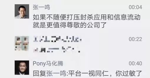 随后张一鸣又在朋友圈表示“如果(腾讯)不随便打压封杀应用和信息流动,就是更值得尊敬的公司了。马化腾则直言张一鸣“过敏了”,并放话“平台一视同仁”。