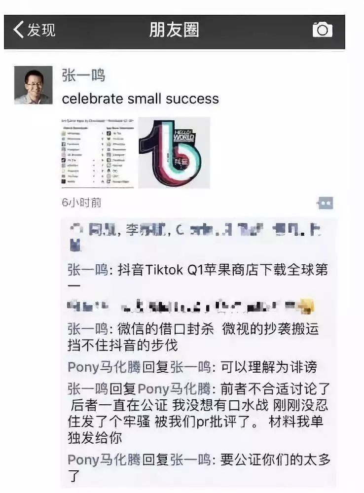 其实头条张一鸣和腾讯小马哥的嘴炮双方已经驾轻就熟,就在这个月初的8号,张一鸣凌晨在朋友圈发文庆祝抖音国际版“Tiktok”2018第一季度在苹果商店下载全球第一,庆祝归庆祝,但不甘寂寞的张一鸣偏要搞事情,在下面评论区点名腾讯,说微信的借口封杀,微视的抄袭搬运挡不住抖音的步伐。