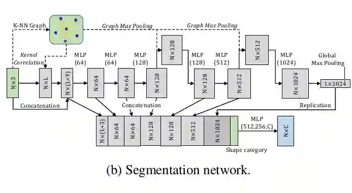 图2 显示了KCNet架构。前端核相关层利用局部几何结构计算每个数据点的K个最近邻点和L个点集内核之间的不同亲和度,每个内核包含M个可学习的3D点。得到的响应与原始3D坐标连接。稍后,图池化层将利用局部特征结构,每个3D对象实例共享相同的从点云的3D欧几里德邻域离线构建的图。