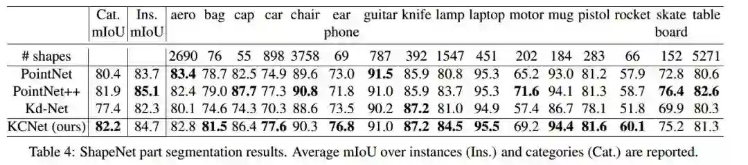 表4 显示了 KCNet在 ShapeNet part segmentation 的结果。