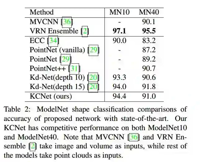 表2 显示了 所提出KCNet和其他最先进网络在 ModelNet形状分类的精确度。
