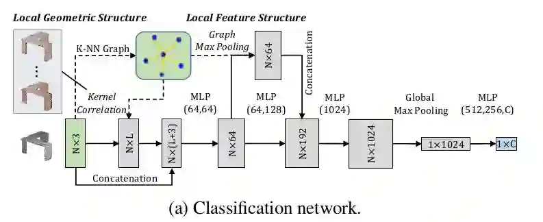 在这方面,我们提出了两项新的操作,以更有效地利用局部结构来改进PointNet。第一个侧重于局部3D几何结构。类似于图像的卷积核,我们将点集内核定义为一组可学习的3D点,它们根据由核相关性度量的几何亲和力联合响应一组相邻数据点,改编自点云配准的相似性技术。第二个操作通过在从3D位置计算的最近邻图上的递归特征聚合来利用局部高维特征结构。