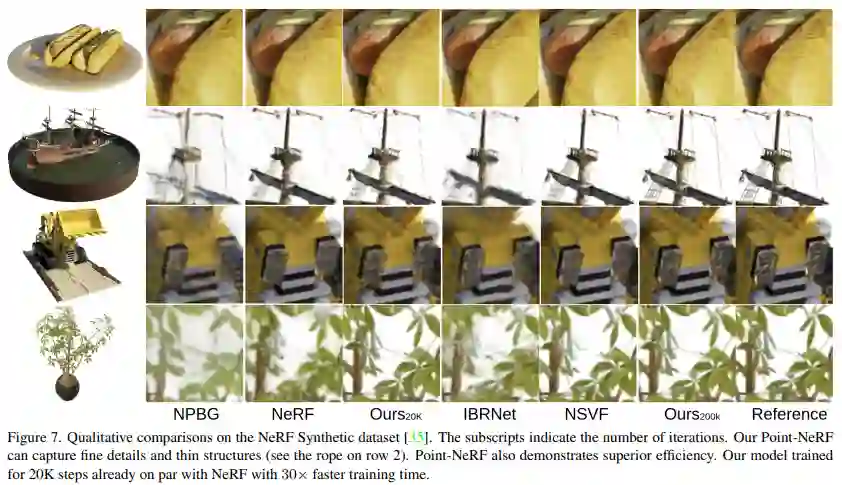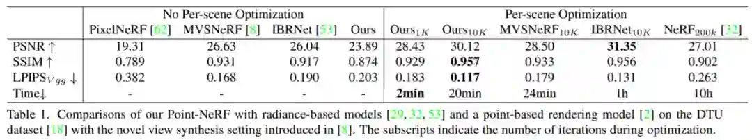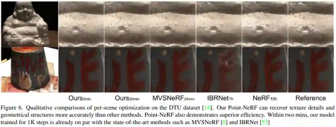 虽然 IBRNet 中更复杂的特征提取器可以提高质量,但它会增加内存使用,影响训练效率。更重要的是,Point-NeRF 生成网络已经提供了高质量的初始辐射场,以支持高效优化。该研究发现,即使经过 2 min / 1K 的微调迭代,Point-NeRF 也能获得非常高的视觉质量,可与 MVSNeRF 最终的 10k 次迭代结果相媲美,这也证明了 Point-NeRF 方法重建效率的高效性。
