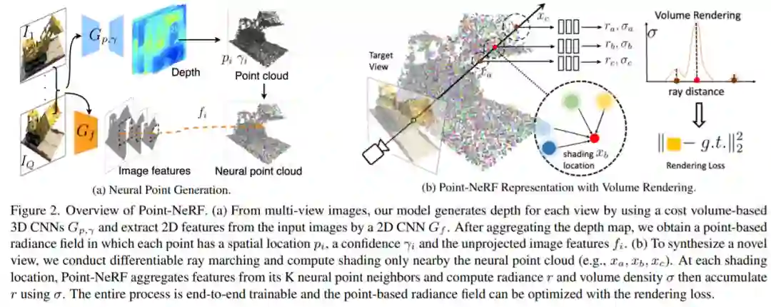 Point-NeRF 是基于点的神经辐射场,这是一种高质量神经场景重建和渲染的新方法,图 2 (b)为架构图:
