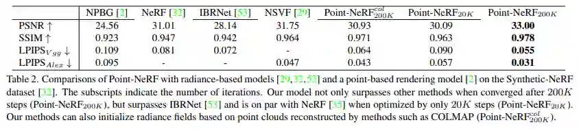 虽然 Point-NeRF 是在 DTU 数据集上训练而来,但其可以很好地泛化到新的数据集。该研究展示了在 NeRF synthetic 数据集中,Point-NeRF 与其他 SOTA 方法比较结果,定性结果如图 7 ,定量结果如表 2。
