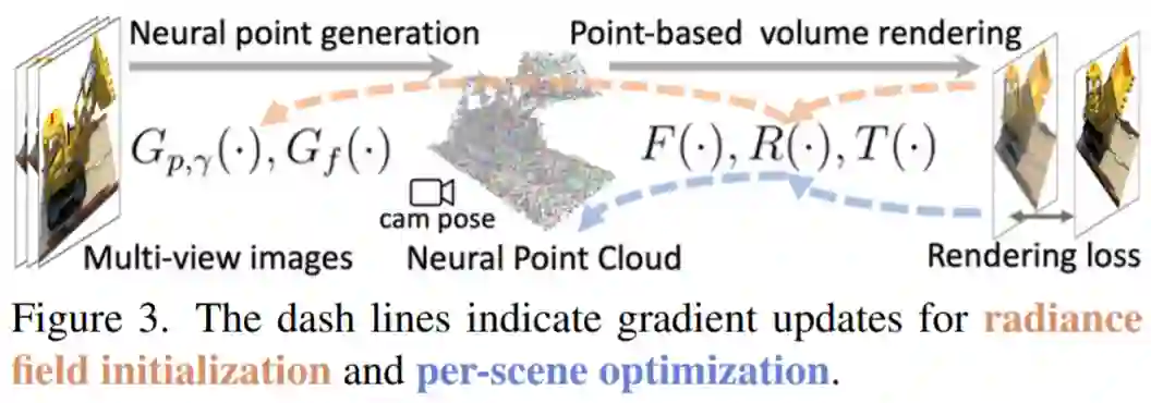 Point-NeRF 重建 pipeline 可用于有效地重建基于点的辐射场。首先利用跨场景训练的深度神经网络,通过直接网络推理生成基于点的初始场。这个初始场通过点增长和剪枝技术进一步优化每个场景,从而实现最终的高质量辐射场重建。图 3 显示了这个工作流程,其中包含用于初始预测和场景优化的相应梯度更新。