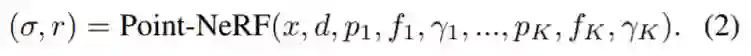 给定任意 3D 位置 x,在半径为 R 的范围内查询 K 个相邻神经点。基于点的辐射场可以抽象为一个神经模块,它从邻近的神经点对任何阴影位置 x 上的视觉依赖亮度 r(沿任何视觉方向 d)和体积密度σ进行回归,如下所示: