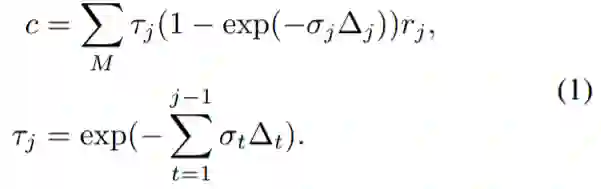 体渲染和辐射场:基于物理的体渲染可以通过可微射线推进(differentiable ray marching)进行数值计算。具体而言,一个像素的辐射可以通过一束光线穿过该像素来计算,在 {x_j | j = 1, ..., M} 中沿射线采样 M 个着色点,并使用体积密度累积辐射,如:
