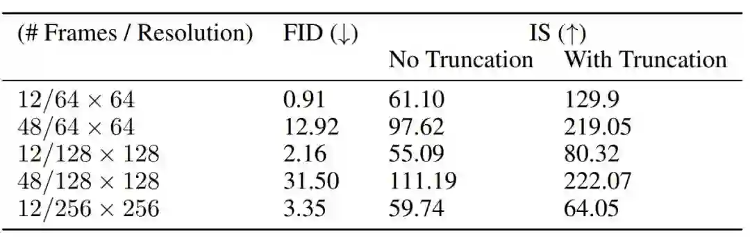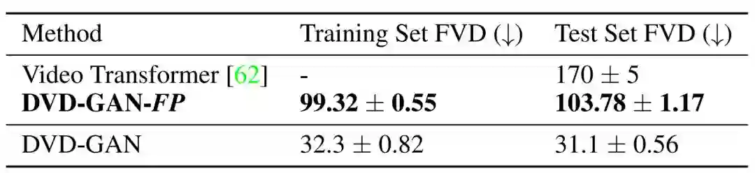 表 1:DVD-GAN 在 Kinetics-600 视频合成任务中的 FID/IS 得分。