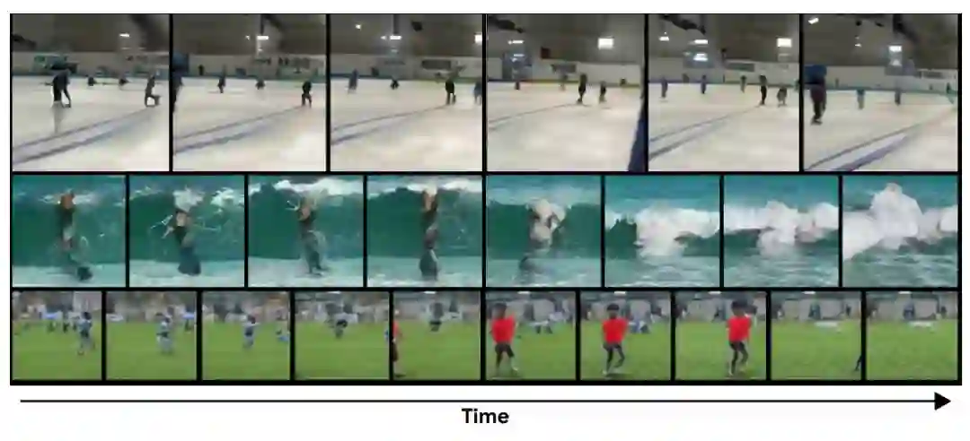 DVD-GAN 在 12 帧 256 × 256 Kinetics-600 样本上训练得到的视频帧。