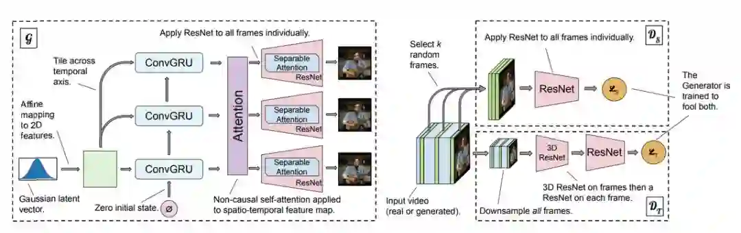 图 3:DVD-GAN 模型架构图示。左图为生成器,右图为判别器(D_S/D_T)。