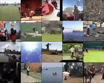 DVD-GAN 在 12 帧 128 × 128 Kinetics-600 样本上训练得到的视频帧。