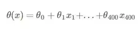假设我们现在要解决的是识别图片中的0或1(样本库只有0和1的图片),图片大小是20*20,那么这个时候有400个特征向量,那么边界函数为: