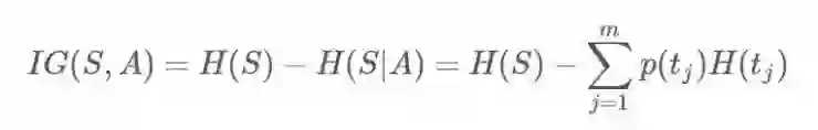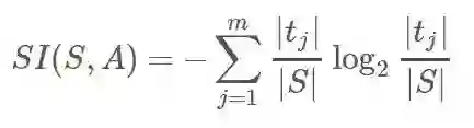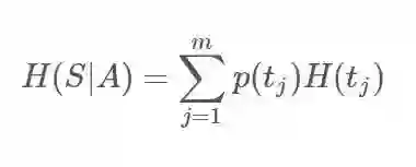 这里,在属性A的条件下,数据被划分成m个类别(例如,属性A是体重,有轻、中、重三个选项,那么m=3),p(tj)表示类别tj(属性A中所有具有第j个特性的所有数据)的数量与S总数量的比值,H(tj)表示子类别tj的熵。