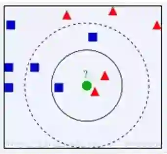 如上图,绿色圆要被决定赋予哪个类,是红色三角形还是蓝色四方形?如果K=3,由于红色三角形所占比例为2/3,绿色圆将被赋予红色三角形那个类,如果K=5,由于蓝色四方形比例为3/5,因此绿色圆被赋予蓝色四方形类。