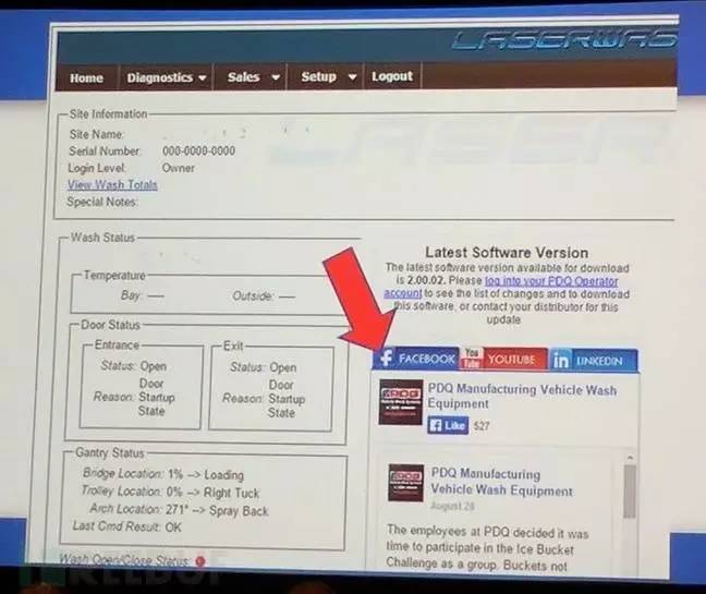 研究人员发现 Laserwash 设施可被远程监控,通过基于 web 的用户界面就能控制系统。实际上洗车设施内部有个 web 服务器,挂接到公网上就能被攻击者远程监视。该设施的控制系统实际上是个嵌入式 Windows CE 计算机,采用 ARM 兼容处理器。不过当前微软已经不再支持其上所用的 Windows CE 版本,所以本质上就存在安全威胁。