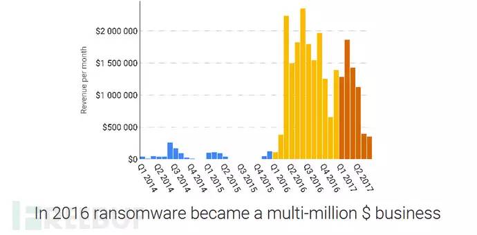 研究结果显示,2016 年是勒索软件收获最多的一年。每个月勒索软件赎金支付平均超过 100 万美元,有两个月甚至超过了 200 万美元。而最赚钱的两个勒索程序家族分别是 Locky 和 Cerber 。Locky 的成功和 Necurs 垃圾信息僵尸网络是分不开的,同时它还采用 RaaS 服务的方式,攻击者根本不需要多少技术知识,就能用上 Locky。谷歌的研究显示,Locky 赚到 780 万美元。排在第二的 Cerber 则赚了 690 万美元。更多研究内容可点击原文查看。