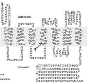 推测的NPR-28受体的跨膜结构(其中蓝色氨基酸代表该蛋白的多样性)