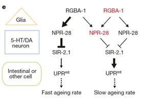 因此,RGBA-1-NPR-28信号是通过调节UPRmt的活性发挥作用。此外,不同线虫虫株中UPRmt的活性有所不同,暗示着UPRmt是衰老速度的关键调节因子。