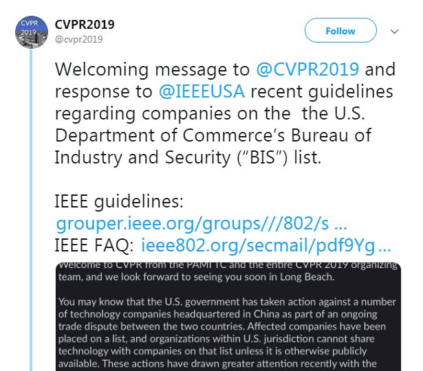 您可能知道,受中美贸易战的影响,美国政府已经对总部在中国的一系列科技公司采取了制裁手段。受到影响的公司已经被列入名单,受美国管辖的组织都不能和这份名单上的公司共享技术,除非这些技术已经被公开。近日,由于华为事件,美国政府的这些行动受到了广泛的关注,而华为一直是CVPR的主要参与者之一。IEEE 最近小心翼翼地公布了这些限制,并制定规则来阻止它们的组织和名单上的公司分享论文,除非这些论文已经公开发表。这一行为影响了我们同行评议的过程,招致了我们社区内外人员的困惑和不解。