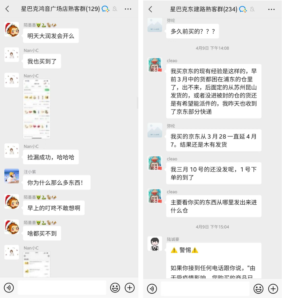 比如,上海疫情期间,大家在群内询问疫情、团购、发货等事宜,互帮互助。