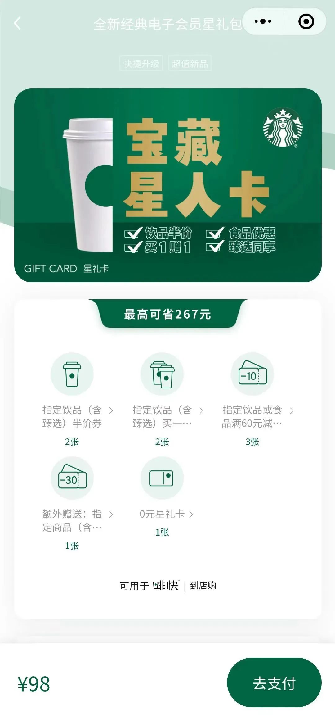 在用户视角看来,自己买一杯咖啡需要40元,但是花98元买了星享卡后,不仅能免费喝一杯,还能享受到一系列优惠权益,性价比十足。还能直接成为玉星级,享受到玉星级的权益。