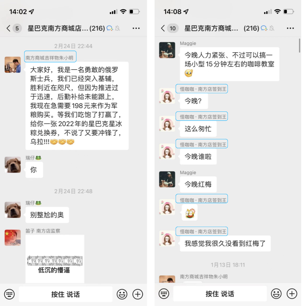 咖啡师在上班空余时间,也会在群内以朋友、挚友视角,与大家交流、互动,玩在一起,甚至彼此扮演着多重身份角色。