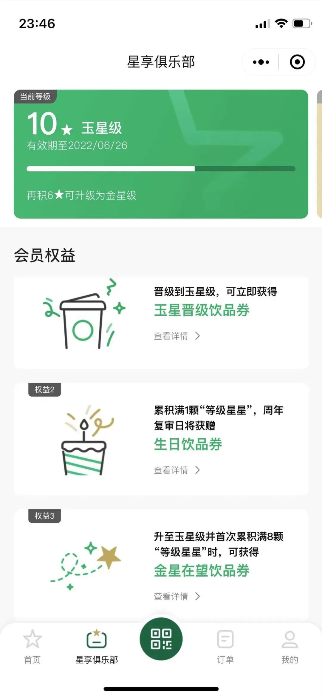 此外,用户购买星享卡后能直接晋升至玉星级,获得晋升奖励—免费饮品券。