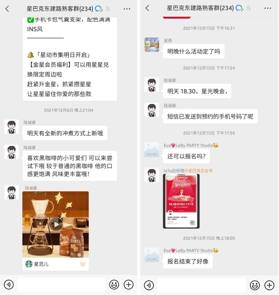 基于星巴克「第三空间」门店氛围,咖啡师可在企微群内邀请用户到线下来参加咖啡品鉴会、xxx会,增进用户与用户、用户与咖啡师之间的联结。