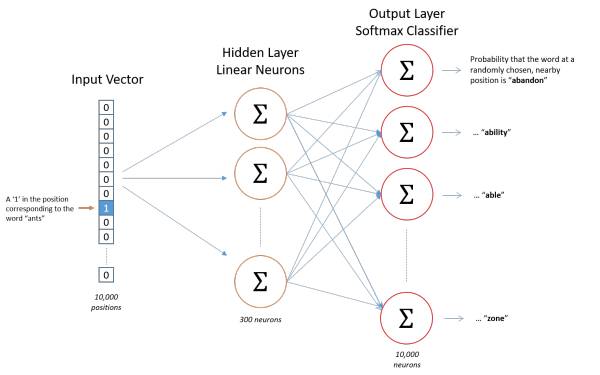 经过神经网络隐层的计算,ants这个词会从一个1 x 10000的向量变成1 x 300的向量,再被输入到输出层。输出层是一个softmax回归分类器,它的每个结点将会输出一个0-1之间的值(概率),这些所有输出层神经元结点的概率之和为1。
