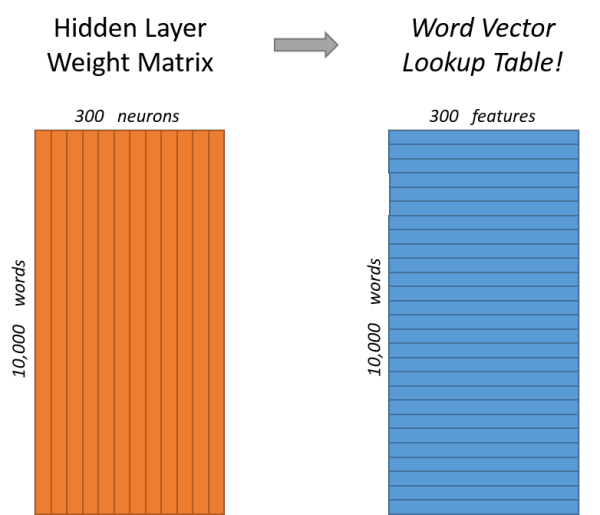 为了有效地进行计算,这种稀疏状态下不会进行矩阵乘法计算,可以看到矩阵的计算的结果实际上是矩阵对应的向量中值为1的索引,上面的例子中,左边向量中取值为1的对应维度为3(下标从0开始),那么计算结果就是矩阵的第3行(下标从0开始)—— [10, 12, 19],这样模型中的隐层权重矩阵便成了一个”查找表“(lookup table),进行矩阵计算时,直接去查输入向量中取值为1的维度下对应的那些权重值。隐层的输出就是每个输入单词的“嵌入词向量”。