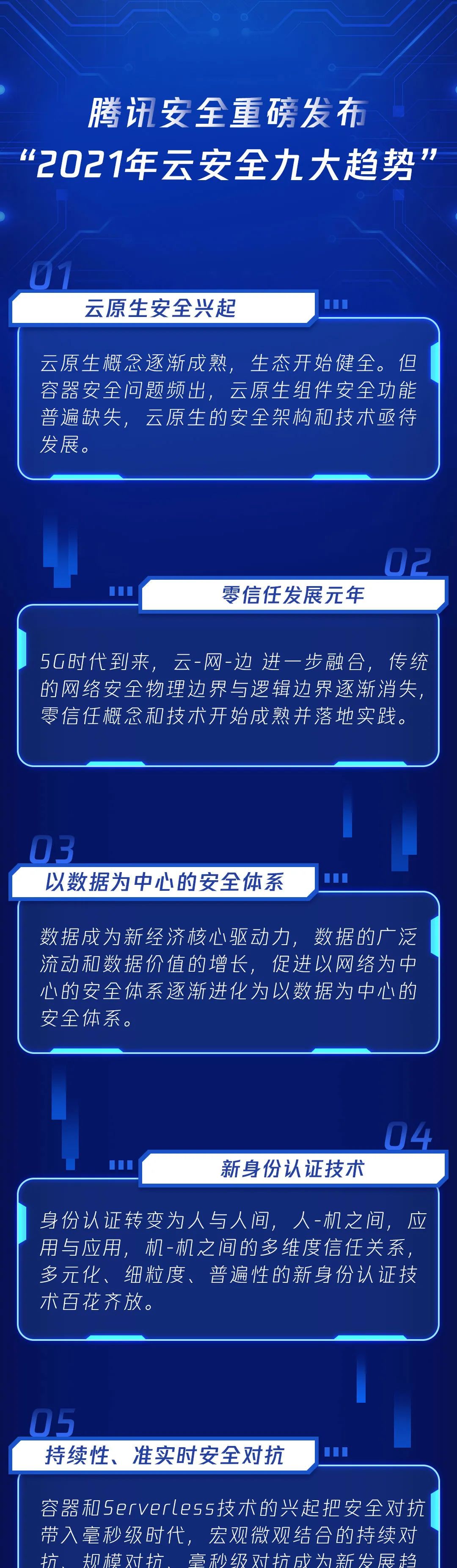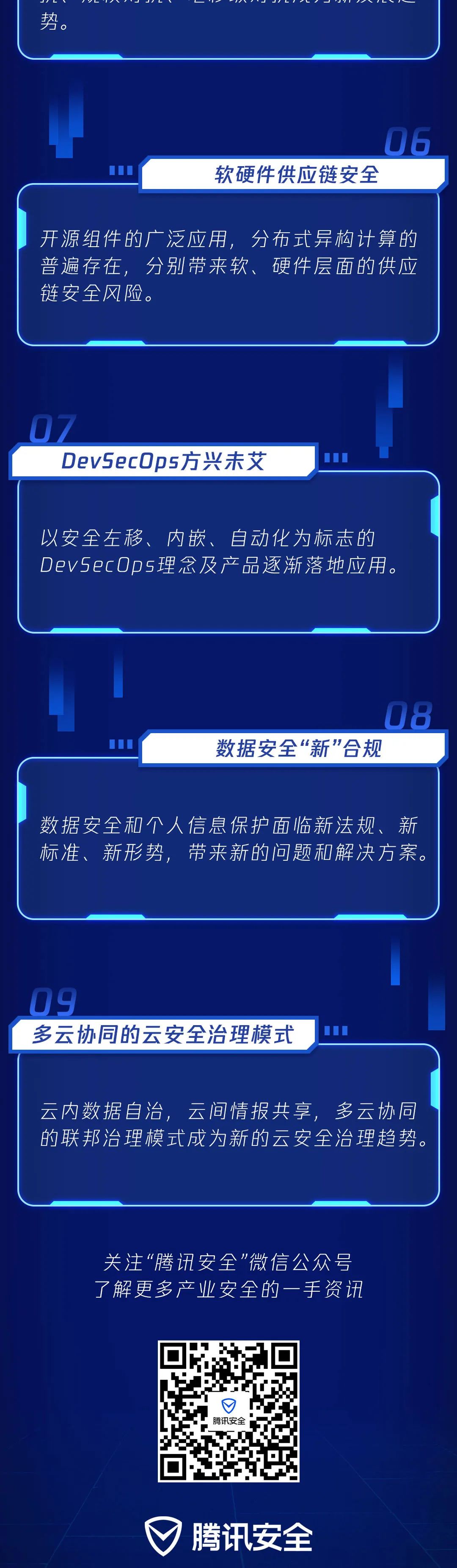 此前,腾讯云安全副总经理李滨基于腾讯云安全建设的实践和云鼎实验室的前沿研究,发布了《2021 云安全九大趋势》,致力于探索新基建快速发展之下,技术快速迭代、法律法规相继出台,云安全建设面临的全新挑战,为企业云上安全建设和云安全技术发展方向提供新指南。