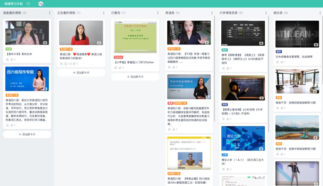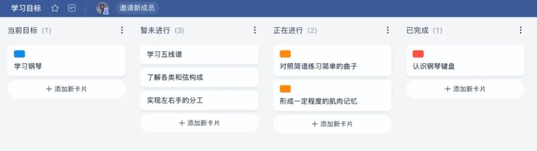 人类总渴望进步,我们有时会想要学习一种乐器、掌握一门编程语言……但这往往都是一些大而宽泛的任务,比如我的 Things 里就记录了「学习钢琴」「学习 Swift」等任务,但一直不知从何下手。但在板栗看板中,你可以让自己逐渐学会拆分学习目标,并督促自己完成目标。板栗看板可以用作 to do list,比如我创建了一个「学习目标」看板,把「学习钢琴」等目标拆分成多张任务卡片,然后将列表做成「未进行」「正在进行」和「已完成」三个主要阶段,安排自己的学习进程。学习目标 这样一来,我既可以通过看板来查看自己还有哪些学习任务没有完成,也可以时刻追踪自己的学习进度。得益于标签系统,我可以对每张卡片的重要性一目了然。我也会将自己练习钢琴的曲谱和录音作为「附件」,存放在任务卡片里,时刻回顾并找出问题所在。当然,这种用法还可以结合上面提到的信息整理方法,做出更好用的看板。板栗看板的推荐用法里,就利用看板进行网课学习计划,首先将精选的网课链接收藏下来并分类整理,然后安排自己的网课学习计划,最后用to do的方式一一刷课,实现资源从「分散收集」到「集中管理」再到「计划分配」。网课学习计划