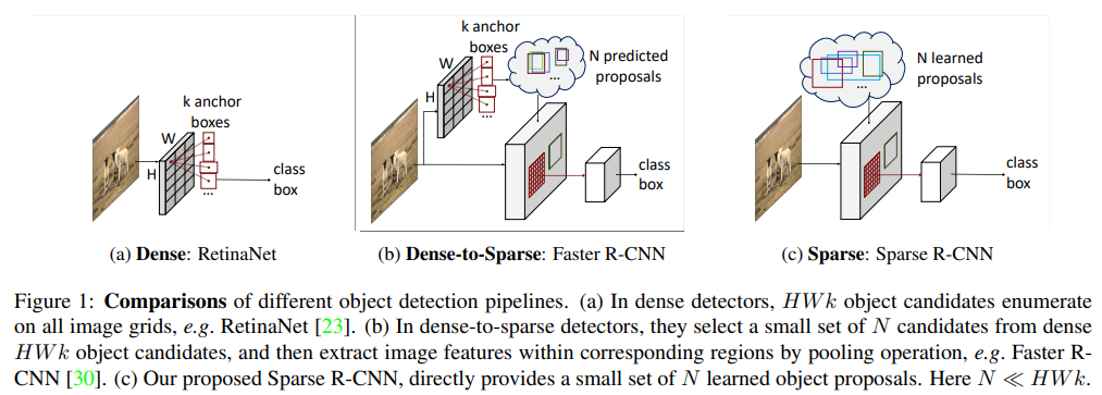 RetinaNet、Faster R-CNN 与 Sparse R-CNN 的比较。