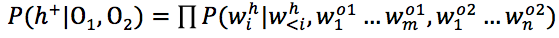 • h+:一个合理的假设,解释了两个观测值O1和O2。
